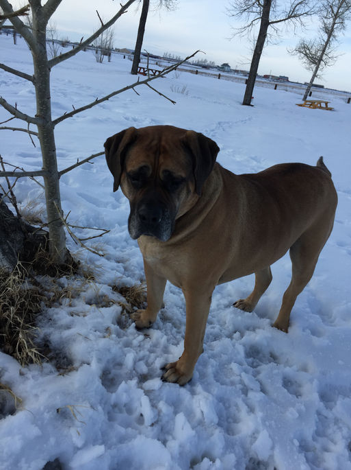 Winnie is our very first mastiff in our home. She has an attitude like no other. when she was younger she ate a couch and a multitude of other things. As soon as you would open the front door she would bolt as fast as she could, who knows where she was headed. You would do something that she apparently didn't like, and she would go pee somewhere out of spite. My husband and I both worked shift work when we first got her and she would spend her weeks on his parents farm when we were out of town. The farm would be any dogs dream vacation, endless acres to roam, unlimited treats, other dogs to play with, a warm bed to sleep on. For the most part Winnie enjoyed going to the farm until one day, when I was laid off for a couple months, and she spent those two months with me going for long walks and hanging out. When I got the call to go back to work, Doug was the one who needed to drive Winnie back to the farm until my shift was over. Well Doug stopped for a coffee, Winnie crawled in the driver seat took a pee and then went back to the backseat. That is how Winnie has been her whole life, albeit stubborn but for the most part a pretty good dog. By the time she was three I was no longer working shift work and she had permanent residence.